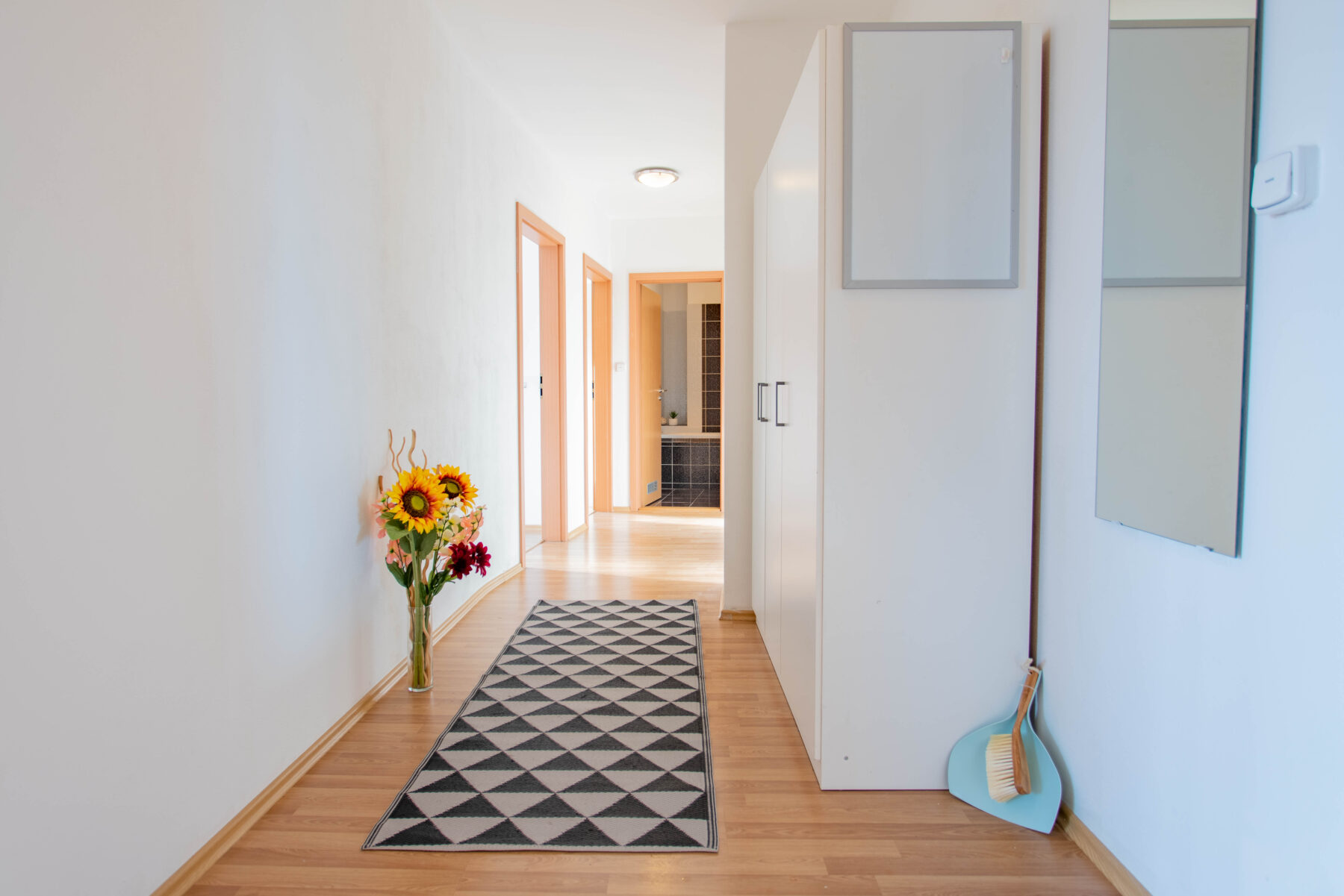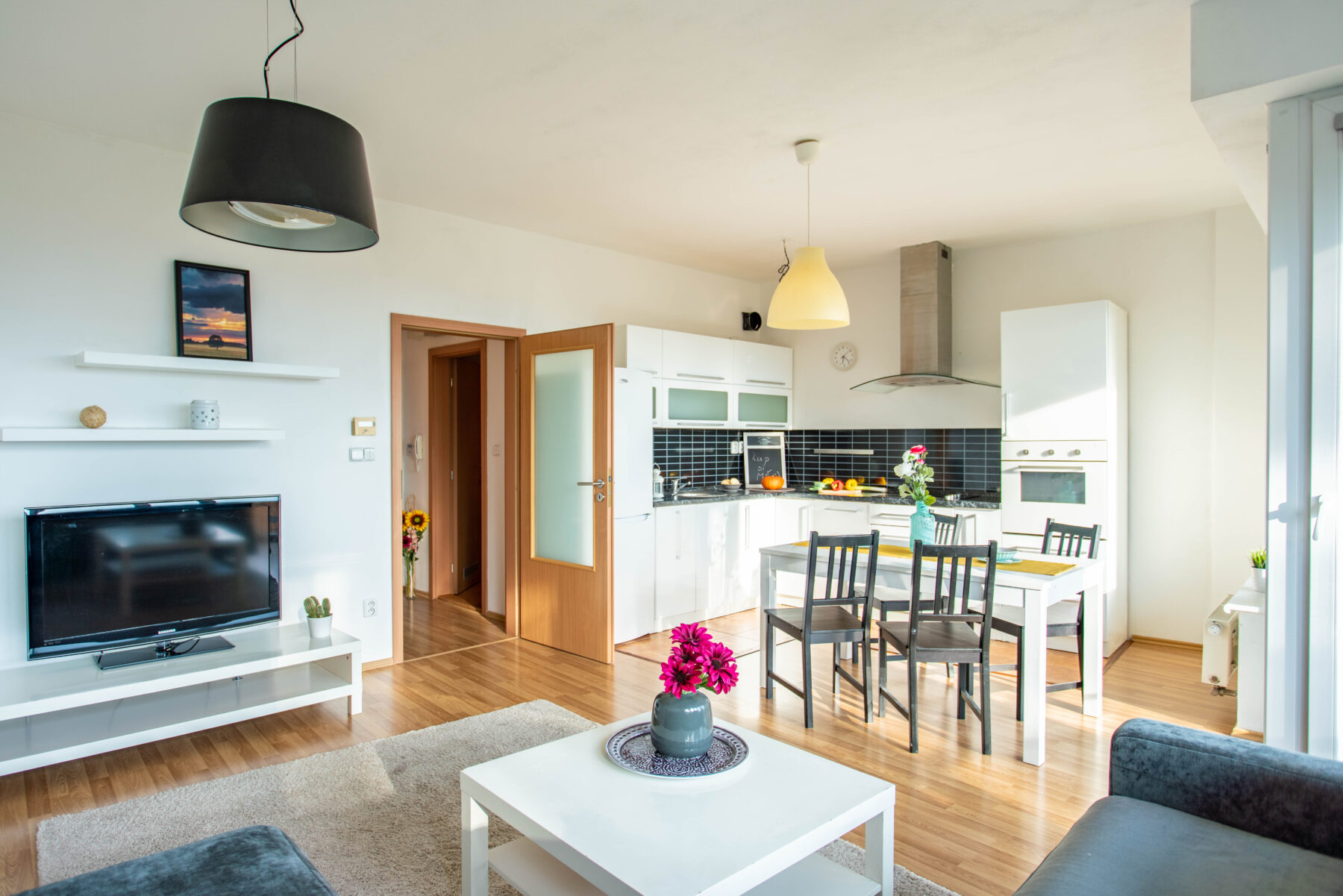 je dispozičně vhodně rozdělen. Z centrálního pokoje s kuchyní je vstup na prostorný balkon. Do dvou neprůchozích pokojů se dostanete z chodby. Do koupelny stejně tak. WC je od koupelny odděleno, součástí bytu je také parkovací stání a sklep.
