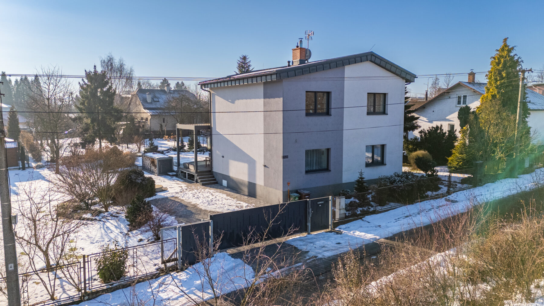 V rámci technických věcí stojí ještě za zmínku venkovní elektrické rolety, vytápění plynovým kotlem, aktivní přítah vzduchu do krbu nebo rekuperace. Protože je dům podsklepen, je zde i prostor pro menší fitko nebo wellness.