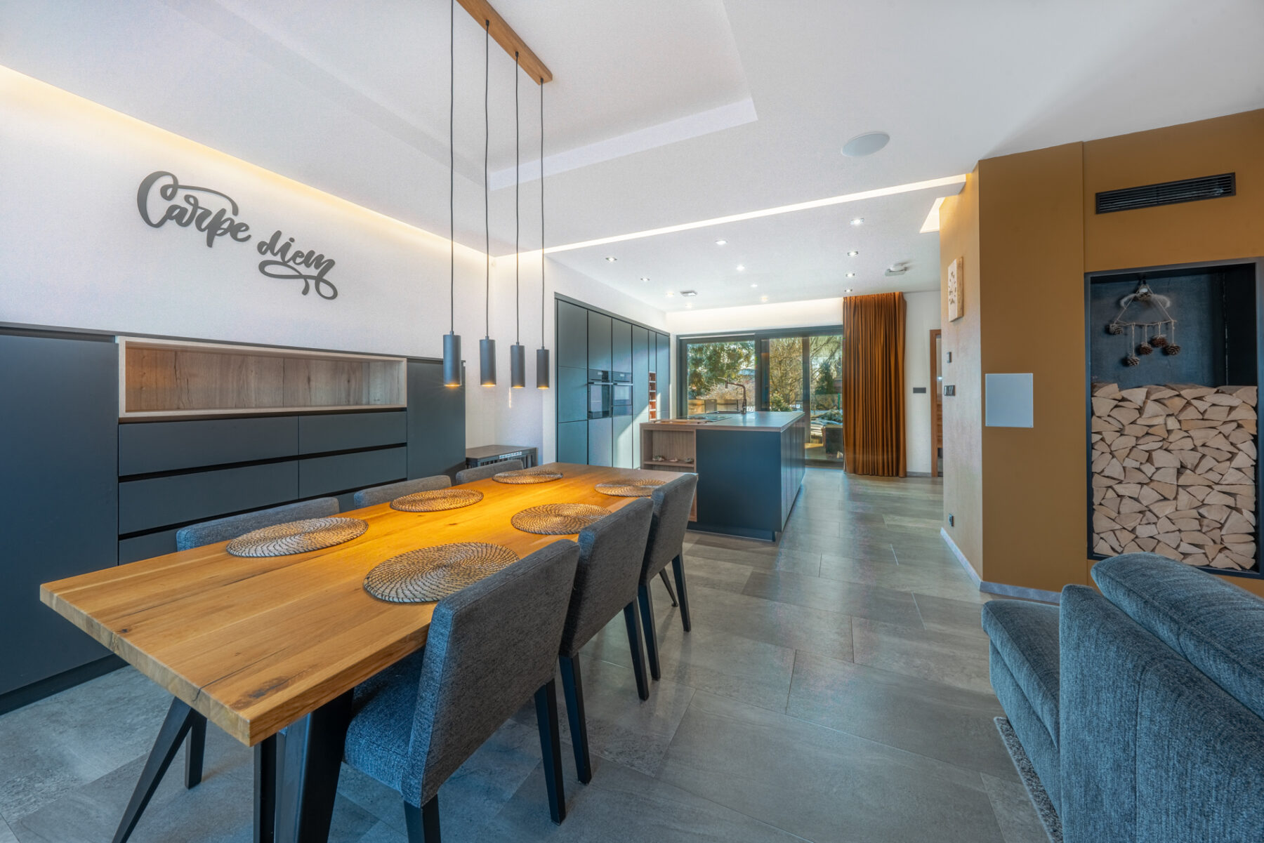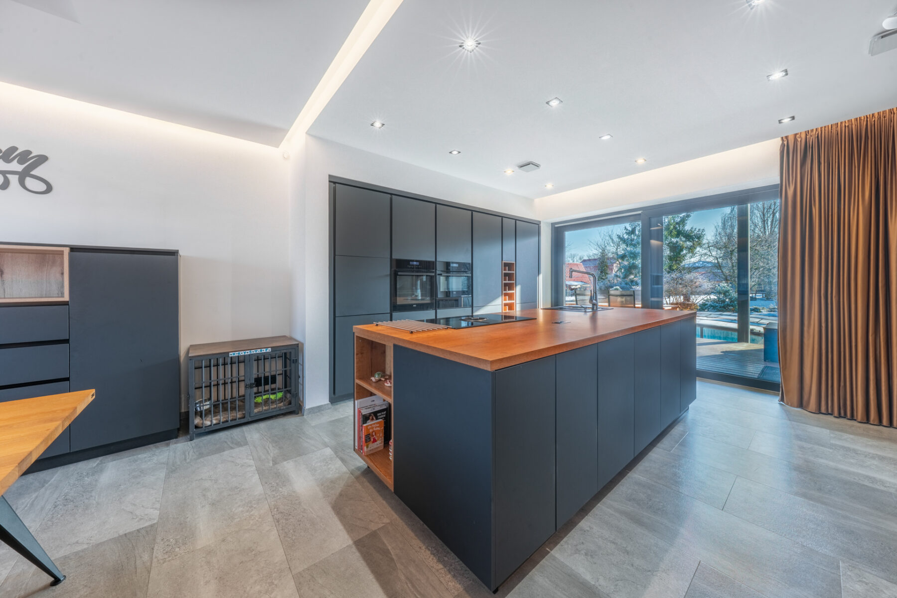 Nadchlo mě propojení obývacího pokoje s jídelní a kuchyňskou částí, které je řešeno do tvaru L. Při práci v kuchyni to nepůsobí rušivě do obývacího pokoje. Protože je zde dostatek světla, kuchyně v kombinaci černého matu a dřeva působí skvěle a vytváří příjemnou domácí atmosféru. Je to určitě i tím, že spotřebiče jsou zabudované a celý prostor působí minimalisticky a vzdušně.