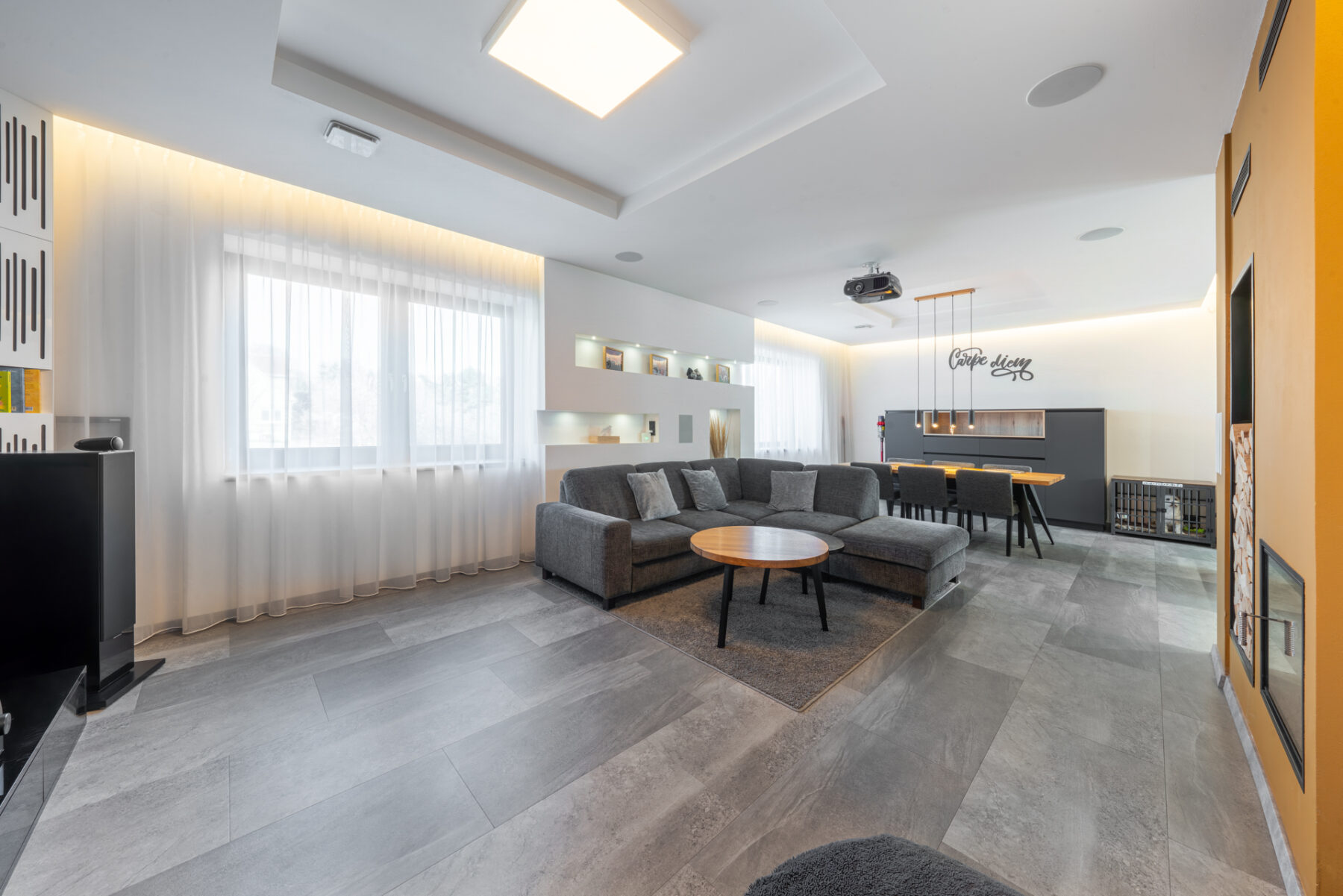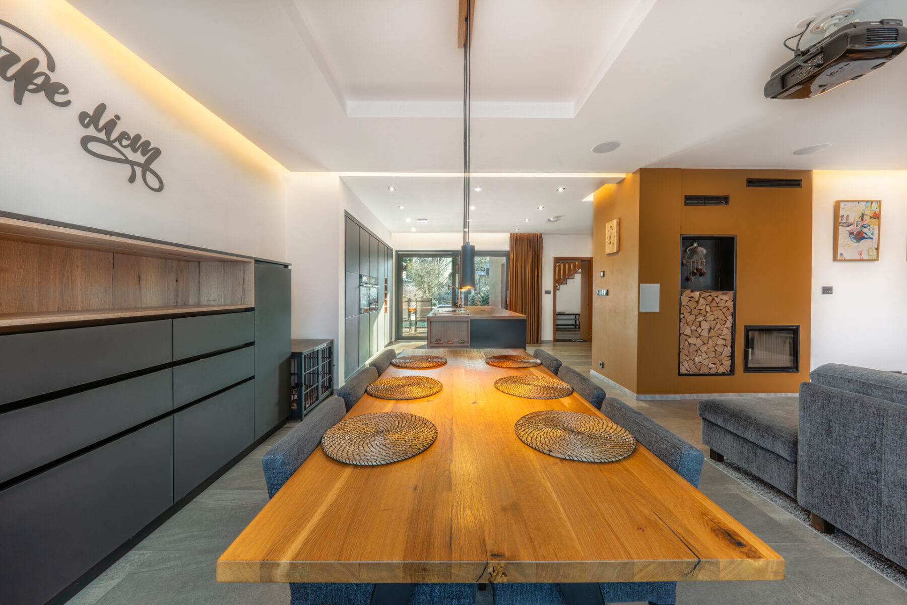 Když si zapálíte krb celou atmosféru posunete ještě kousek dál, protože vás oheň přivítá hned u vstupu a hned tak vás nepustí, protože jde o dvoustrannou krbovou vložku a vidíte do ní nejen z předsíně, ale také z obývacího pokoje. Televizi, sportovní přenosy nebo hry můžete pouštět na televizi nebo zabudovaném projektoru. O zvuk se postará zabudované multikanálové repro.