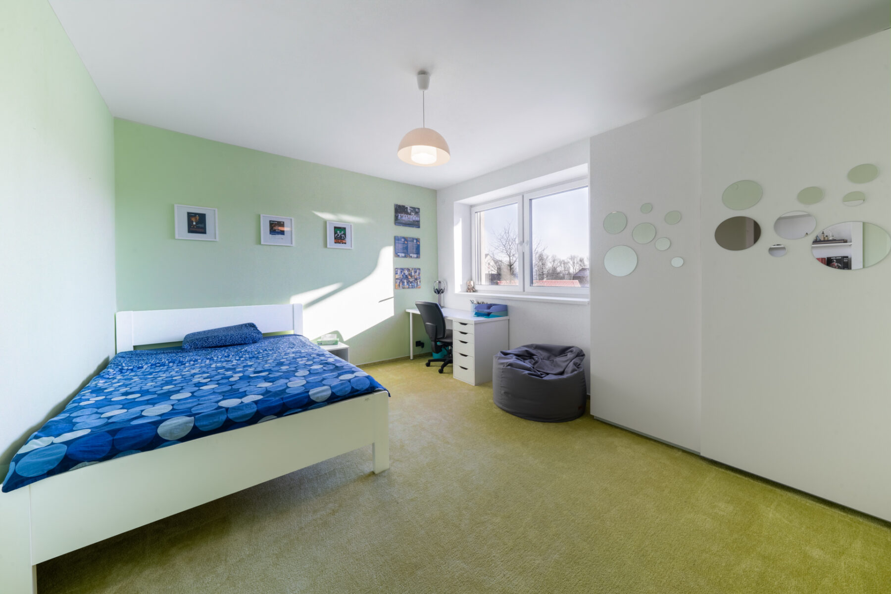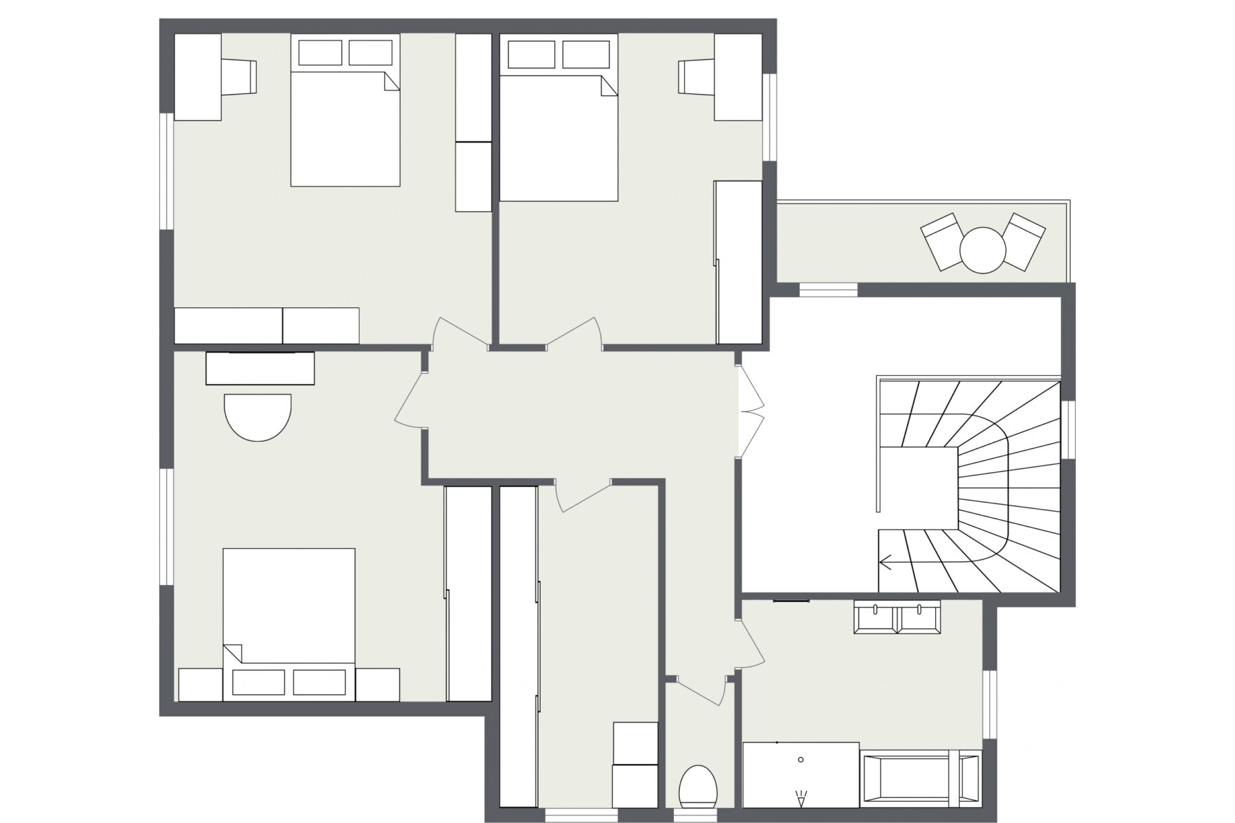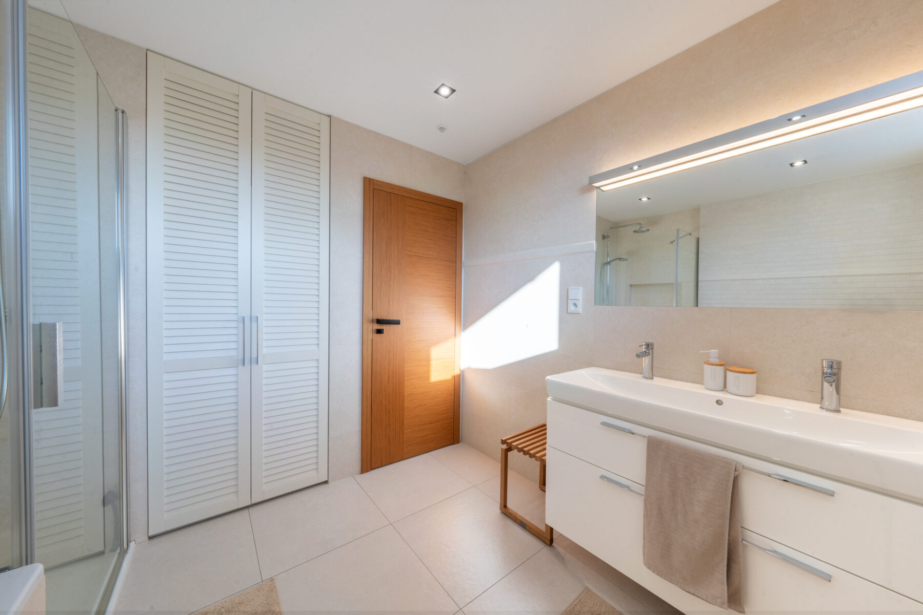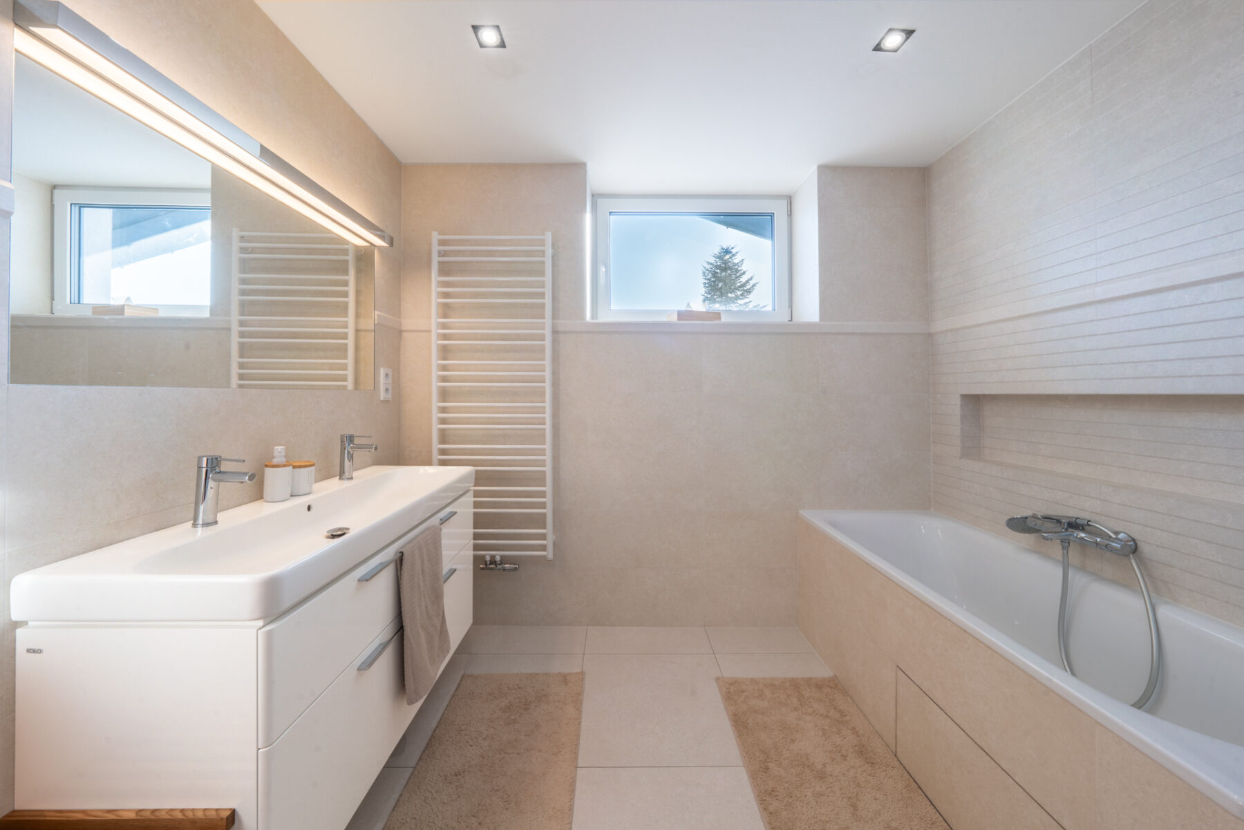 V obou patrech jsou koupelny, vždy s vanou a sprchovým koutem. Dole pak ještě pracovna a nahoře tři velké pokoje, prádelna s šatnou a balkon.
