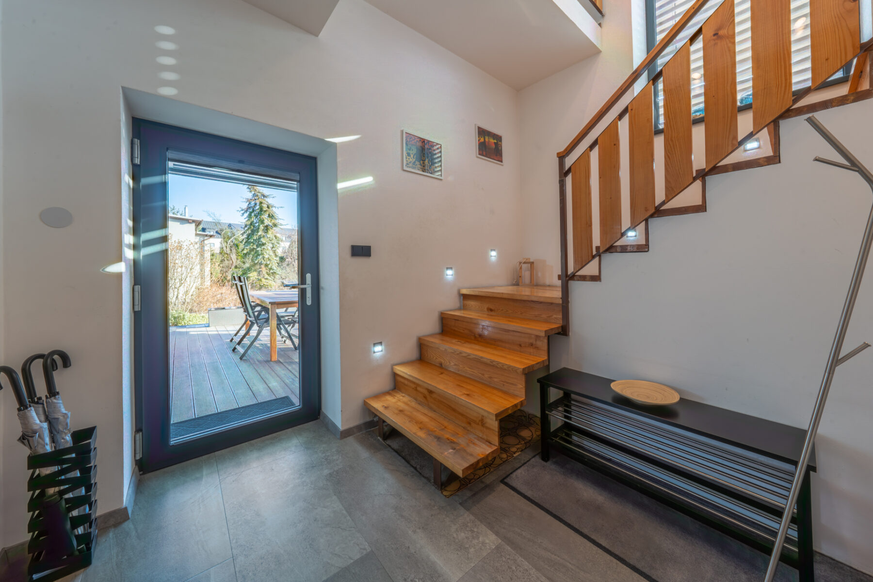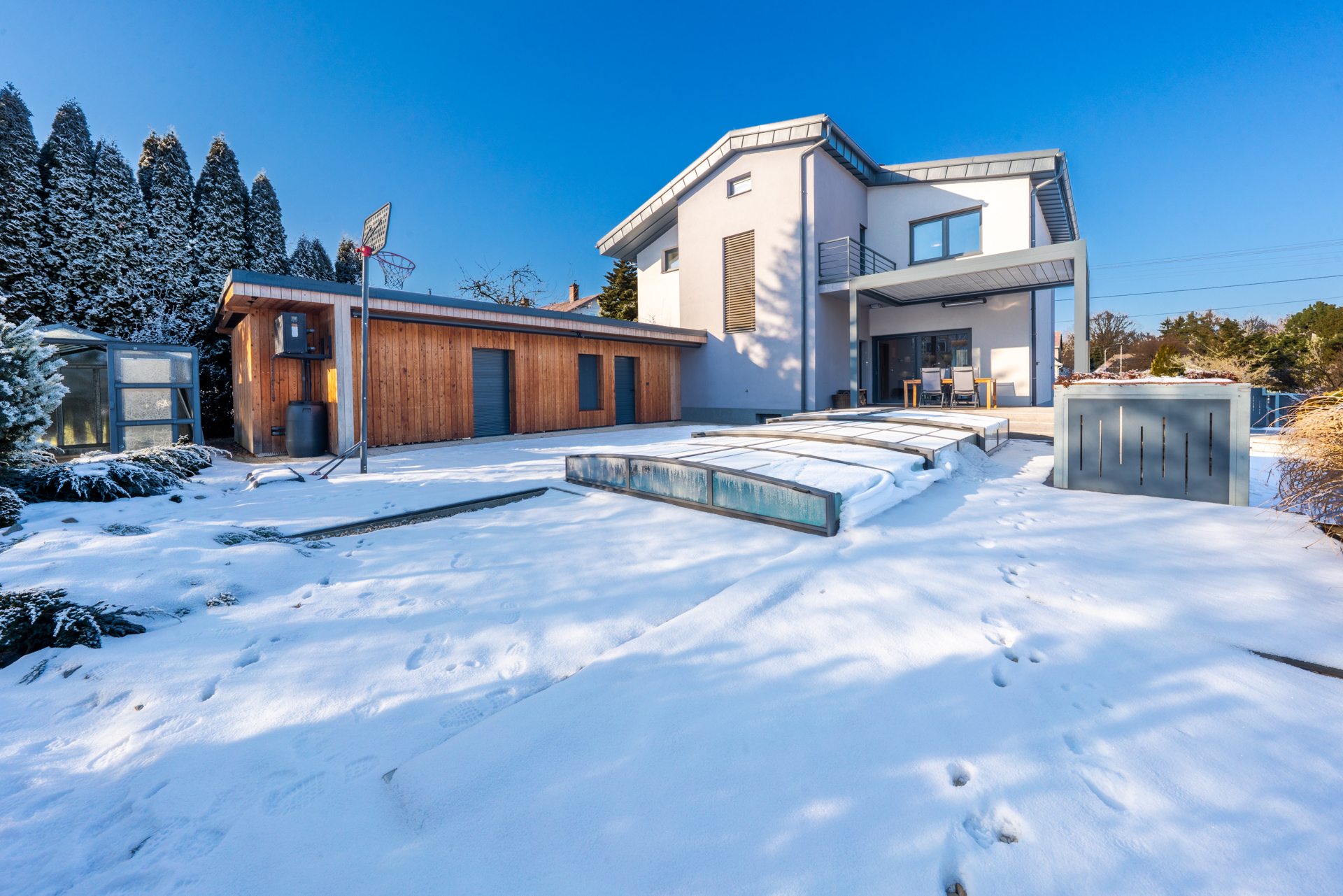 Až vás to uvnitř omrzí, vyběhnete přes HS portál na terasu a skočíte si do bazénu. Ten je krytý a vyhřívaný, takže sezona klidně od března do listopadu. Pergola je hliníková, bioklimatická, s výhřevem i zabudovaným osvětlením.