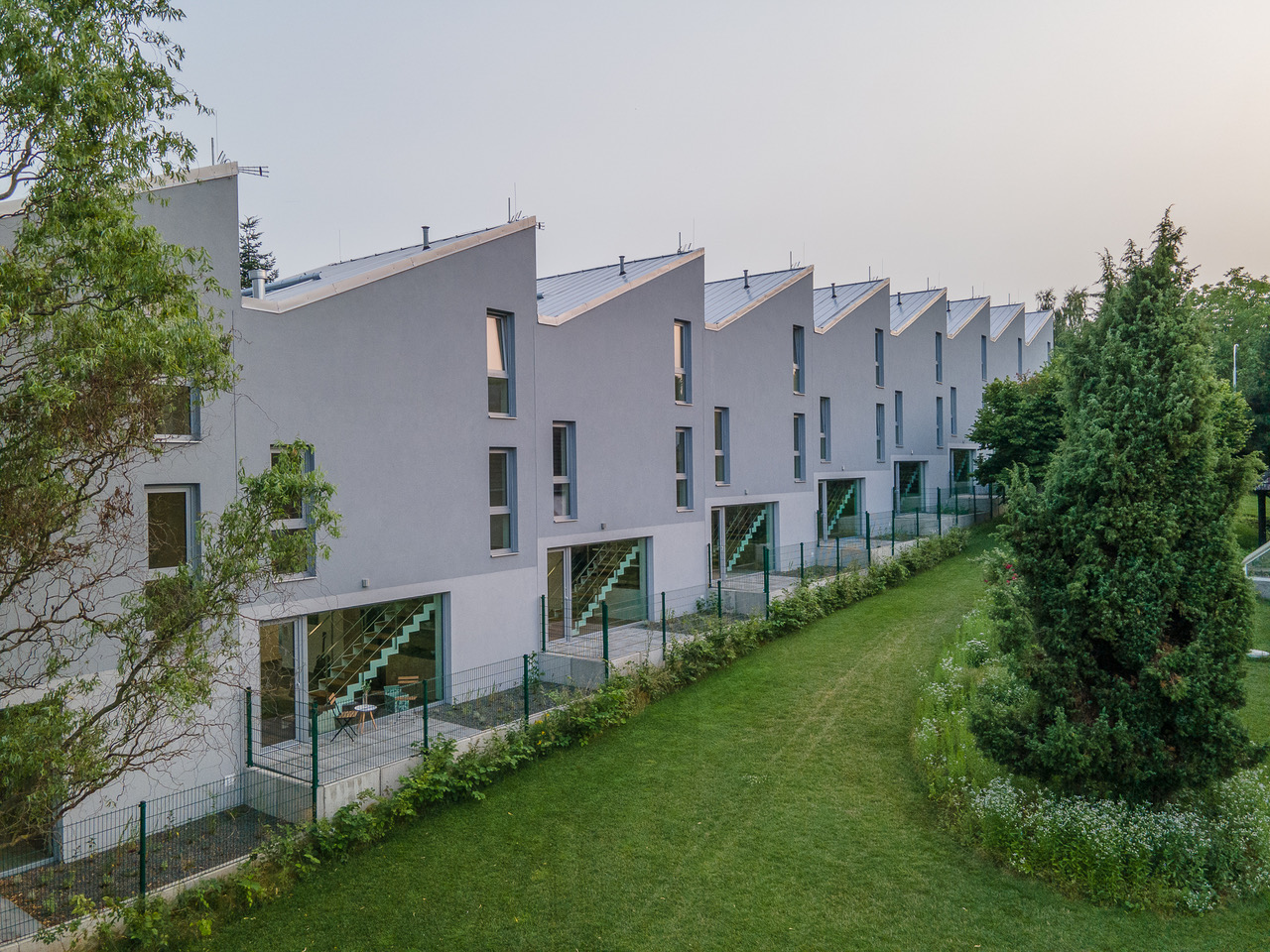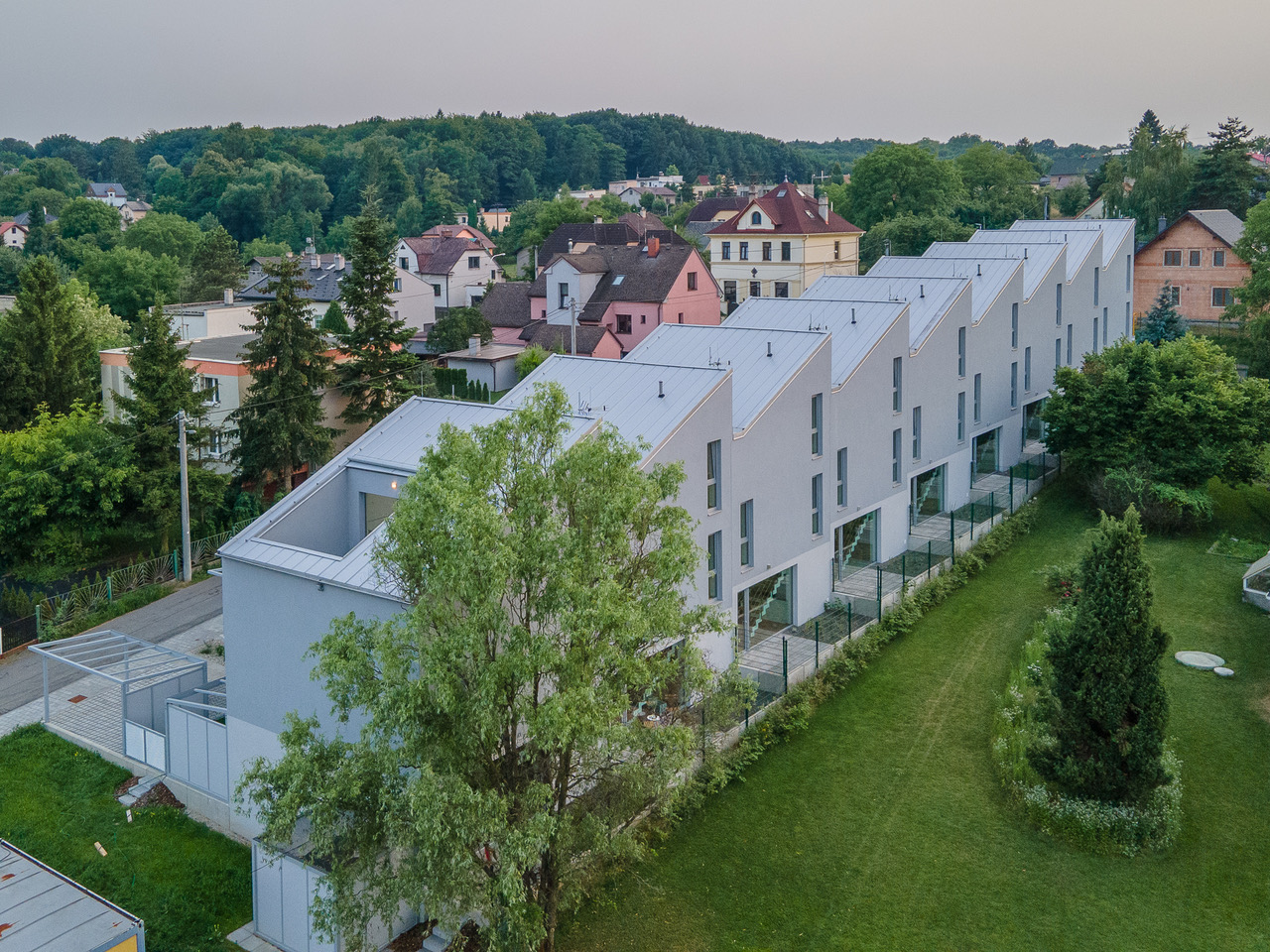 Dům je vhodný zejména pro ty, kteří se nechtějí trápit s hromadou práce kolem domu, ale rádi si užijí všechny jeho výhody. Není tady skoro žádná zahrada, ale jsou tady tři boží terasy: severní za domem pro milovníky stínu, jižní před domem pro milovníky slunce, jako jsem třeba já a východní u ložnice, protože vstávat se sluncem je prostě nejvíc. Zahradní vybavení pohodlně schováte ve skladu před domem. Parkovací stání tady máte dvě a v případě potřeby ještě třetí na chodníku.